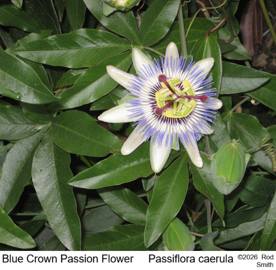 Blue Crown Passion Flower    Med. Sun-Part     flowers in summer. Edible fruit.